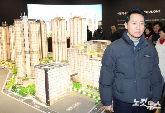 오세훈 서울시장이 12일 서울 노원구 월계동에 위치한 광운대역 물류부지 개발 현장을 방문해 진행 상황을 점검하고 있다.