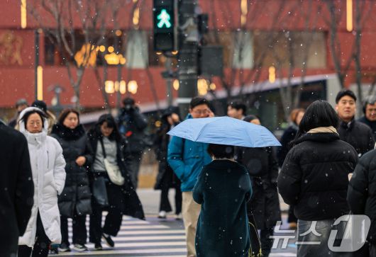 (서울=뉴스1) 이호윤 기자 = 눈이 내리는 12일 서울 세종대로사거리에서 시민들이 길을 건너가고 있다. 2026.1.12/뉴스1256@news1.krCopyright ⓒ 뉴스1. All rights reserved. 무단 전재 및 재배포, AI학습 이용 금지.