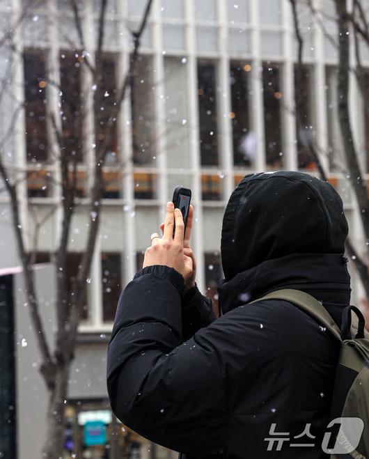 (서울=뉴스1) 이호윤 기자 = 눈이 내리는 12일 서울 세종대로사거리에서 시민이 걸을을 멈추고 눈을 바라보고 있다. 2026.1.12/뉴스1256@news1.krCopyright ⓒ 뉴스1. All rights reserved. 무단 전재 및 재배포, AI학습 이용 금지.
