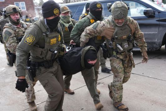11일(현지 시간) 미 미네소타주 세인트폴에서 경찰과 국경수비대 요원들이 한 남성을 체포해 연행하고 있다. 2026.01.12 세인트폴=AP 뉴시스 |