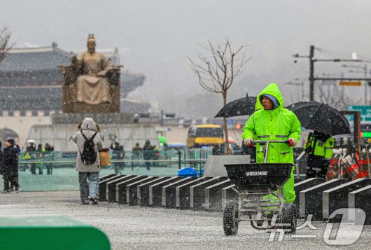 (서울=뉴스1) 이호윤 기자 = 눈이 내리는 12일 서울 광화문광장에서 작업자들이 염화칼슘을 뿌리고 있다. 2026.1.12/뉴스1