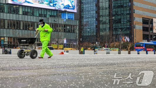 (서울=뉴스1) 이호윤 기자 = 눈이 내리는 12일 서울 광화문광장에서 작업자들이 염화칼슘을 뿌리고 있다. 2026.1.12/뉴스1256@news1.krCopyright ⓒ 뉴스1. All rights reserved. 무단 전재 및 재배포, AI학습 이용 금지.