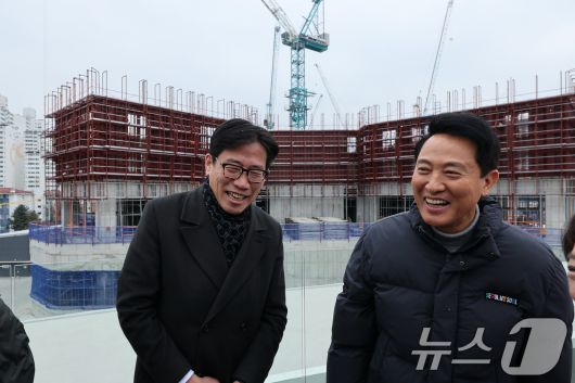 (서울=뉴스1) 황기선 기자 = 오세훈 서울시장이 12일 오후 서울 노원구 광운대역 물류부지 현장을 방문, 공사현장을 살펴보고 있다. 향후 이곳에는 아파트 3032가구를 비롯해 공공기숙사와 생활 SOC(사회간접자본) 등이 들어설 예정이다. 준공 목표 시점은 2028년이다. 2026.1.12/뉴스1