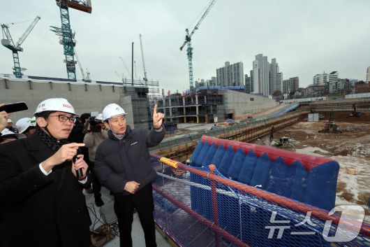 (서울=뉴스1) 황기선 기자 = 오세훈 서울시장이 12일 오후 서울 노원구 광운대역 물류부지 현장을 방문, 공사현장을 살펴보고 있다. 향후 이곳에는 아파트 3032가구를 비롯해 공공기숙사와 생활 SOC(사회간접자본) 등이 들어설 예정이다. 준공 목표 시점은 2028년이다. 2026.1.12/뉴스1