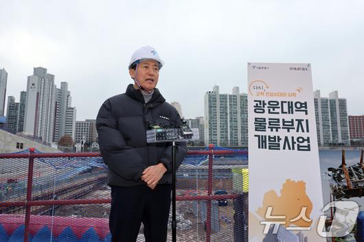 (서울=뉴스1) 황기선 기자 = 오세훈 서울시장이 12일 오후 서울 노원구 광운대역 물류부지 현장을 방문, 공사현장을 살펴본 후 소감을 밝히고 있다. 향후 이곳에는 아파트 3032가구를 비롯해 공공기숙사와 생활 SOC(사회간접자본) 등이 들어설 예정이다. 준공 목표 시점은 2028년이다. 2026.1.12/뉴스1