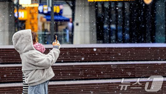 (서울=뉴스1) 이호윤 기자 = 눈이 내리는 12일 서울 광화문광장에서 외국인 관광객이 사진을 찍고 있다. 2026.1.12/뉴스1256@news1.krCopyright ⓒ 뉴스1. All rights reserved. 무단 전재 및 재배포, AI학습 이용 금지.