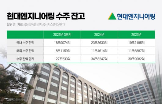 수주 중단 여파는 수주잔고 감소로 이어졌다. 금융감독원 전자공시시스템(DART)에 따르면 지난해 3분기 기준 현대엔지니어링의 수주잔고는 27조233억원으로 재작년 말 대비 약 7조8000억원 줄었다. 매출 기준 일감 규모도 2.4년치에서 1.8년치로 축소됐다.