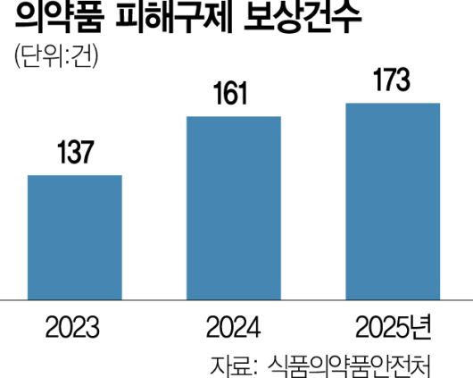 피해구제 보상 규모는 매년 늘고 있다. 식약처에 따르면 의약품 부작용 피해구제 보상 건수는 2023년 137건에서 2024년 161건, 2025년에는 173건으로 늘었다. 누적 보상 금액도 2023년 150억 8000만 원에서 2024년 169억 2000만 원, 2025년에는 196억 2000만 원까지 확대됐다.