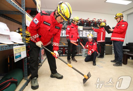 (대구=뉴스1) 공정식 기자 = 겨울철 건조한 날씨가 이어진 12일 대구 동구 지묘동 서원연경공원 산불대응센터에서 산불전문진화대원들이 산불진화장비를 점검하고 있다. 산불예방체계 구축과 초동대응태세 확립을 위해 대구에서 처음 문을 연 이곳 산불대응센터에는 주간 16명의 산불전문진화대원이 근무하며, 산불 예방과 진화 활동에 나선다. 2026.1.12/뉴스1