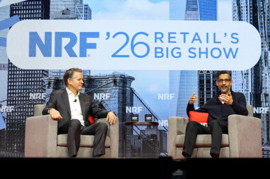 순다르 피차이(오른쪽) 구글 최고경영자와 존 퍼너 월마트 최고경영자가 지난 11일(현지시각) 미국 뉴욕에서 열린 ‘전미소매연맹(NRF) 2026: 리테일 빅 쇼’에서 두 회사가 인공지능(AI)을 어떻게 도입하고 있는지를 주제로 대담을 하고 있다. 로이터 연합뉴스 |