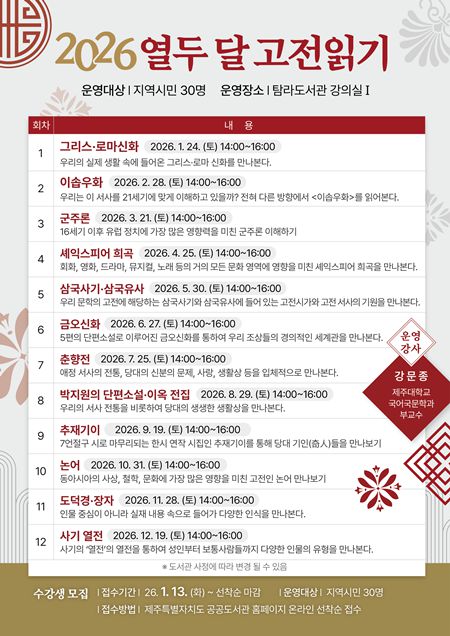 (제주=국제뉴스) 문서현 기자 = 탐라도서관이 1년 동안 동·서양 고전 12편을 함께 읽는 '열두 달 고전 읽기'를 운영하며, 시민들과 함께 사유의 깊이를 넓히는 인문 여정을 시작한다.