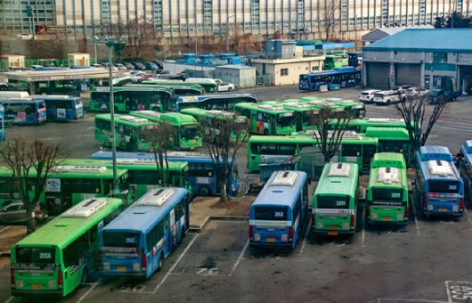 1월 13일로 예고된 서울시 시내버스 총파업을 하루 앞둔 12일 서울의 한 버스공영차고지에 시내버스들이 주차돼 있다. [사진=연합뉴스] |