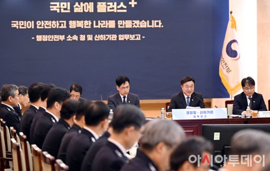 아시아투데이 박성일 기자 = 윤호중 행정안전부 장관이 12일 오후 서울 종로구 정부서울청사에서 열린 경찰청 및 산하기관 3곳 업무보고에 참석해 발언을 하고 있다.