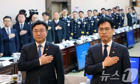 (서울=뉴스1) 임세영 기자 = 윤호중 행정안전부 장관(왼쪽), 김민재 차관 및 참석자들이 12일 서울 종로구 정부서울청사에서 열린 경찰청·산하기관 업무보고에서 국민의례를 하고 있다. 2026.1.12/뉴스1seiyu@news1.krCopyright ⓒ 뉴스1. All rights reserved. 무단 전재 및 재배포, AI학습 이용 금지.
