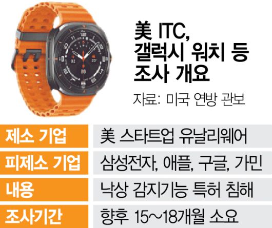 미국 국제무역위원회(ITC)가 삼성전자(005930) 갤럭시워치의 특허 침해 여부에 대한 공식 조사에 착수했다. 텍사스 소재 스타트업 유날리웨어(UnaliWear)가 ‘낙상 감지’ 원천 기술을 삼성전자와 애플·구글 등이 무단 도용했다고 제소한 데 따른 조치다. 특허 분쟁이 ‘갤럭시 링’ 에 이어 갤럭시워치로 번지게 됐다.