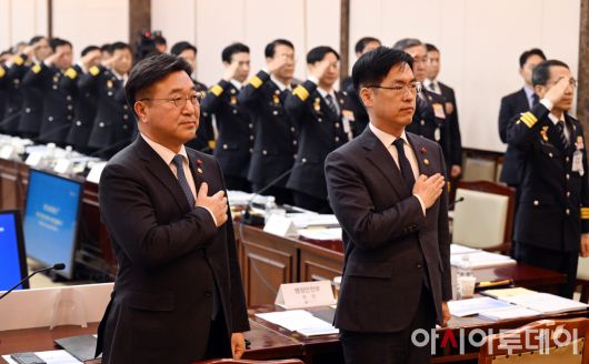 아시아투데이 박성일 기자 = 윤호중 행정안전부 장관이 12일 오후 서울 종로구 정부서울청사에서 열린 경찰청 및 산하기관 3곳 업무보고에 참석해 국민의례를 하고 있다. ⓒ "젊은 파워, 모바일 넘버원 아시아투데이"