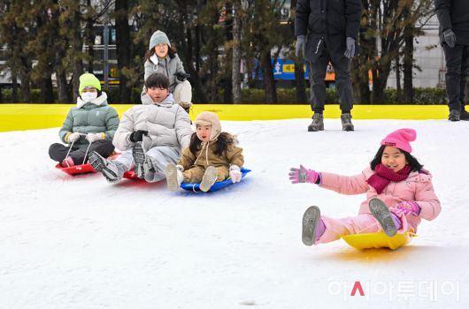 12일 서울 노원구 서울과학기술대학교 종합운동장에 마련된 '2026 노원 씽씽 눈썰매장' 장애인 가족 초청행사에서 참가 어린이들이 눈썰매를 타고 있다. 노원구는 매년 씽씽 눈썰매장을 하루 동안 휴장하고 장애인과 가족 등 500여 명을 초청해 장애인 가족만을 위한 행사를 개최하고 있다. 이날 씽씽 눈썰매장은 초대형 슬로프와, 어린이용 슬로프, 눈 놀이동산, 빙어잡기 체험, 군밤 굽기 체험 등 다채로운 프로그램과 함께 진행됐다. /정재훈 기자