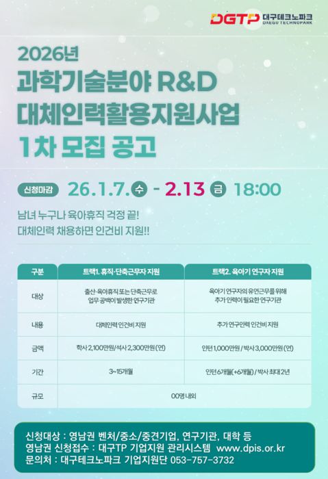 대구테크노파크(김한식 원장)는 2026년 '과학기술분야 R&D 대체인력 활용 지원사업'에 참여할 영남권 R&D 관련 기업 및 연구기관을 내달 13일까지 모집한다.