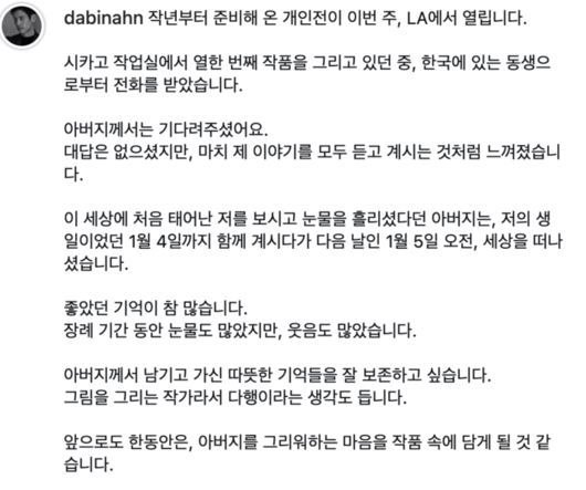그는 “시카고 작업실에서 열한 번째 작품을 그리던 중 동생의 전화를 받았다”며 급박했던 당시를 회상했다. 이어 “아버지께서는 기다려주셨다. 대답은 없으셨지만, 마치 제 이야기를 모두 듣고 계시는 것처럼 느껴졌다”며 임종 직전 아버지와 나누었던 마지막 교감을 전해 먹먹함을 자아냈다.