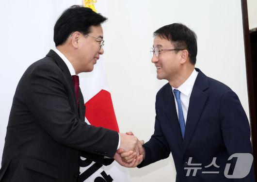 (서울=뉴스1) 유승관 기자 = 한병도 더불어민주당 신임 원내대표(오른쪽)와 송언석 국민의힘 원내대표가 12일 서울 여의도 국회에서 만나 악수하고 있다. (공동취재) 2026.1.12/뉴스1