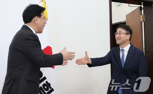 (서울=뉴스1) 유승관 기자 = 한병도 더불어민주당 신임 원내대표(오른쪽)와 송언석 국민의힘 원내대표가 12일 서울 여의도 국회에서 만나 악수하고 있다. (공동취재) 2026.1.12/뉴스1fotogyoo@news1.krCopyright ⓒ 뉴스1. All rights reserved. 무단 전재 및 재배포, AI학습 이용 금지.