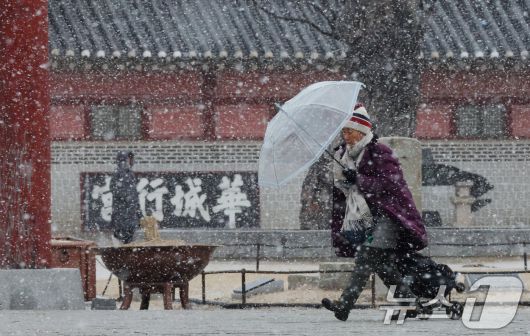 (수원=뉴스1) 김영운 기자 = 중부지방을 중심으로 눈이 내린 12일 경기 수원시 팔달구 화성행궁에서 시민들이 눈을 맞으며 걸어가고 있다. 2026.1.12/뉴스1kkyu6103@news1.krCopyright ⓒ 뉴스1. All rights reserved. 무단 전재 및 재배포, AI학습 이용 금지.