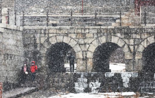 12일 경기도 수원시 세계문화유산 화성(華城) 화홍문에 눈이 내리고 있다. |