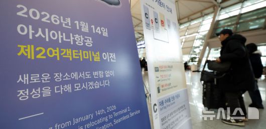 [인천공항=뉴시스] 추상철 기자 = 12일 오전 인천국제공항 1터미널에 아시아나항공의 2터미널 이전 안내문이 게시돼 있다. 아시아나항공은 오는 14일부터 기존 인천국제공항 1터미널에서 2터미널로 운항이 변경된다. 2026.01.12. scchoo@newsis.com |