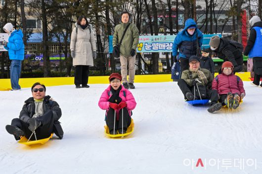 12일 서울 노원구 서울과학기술대학교 종합운동장에 마련된 '2026 노원 씽씽 눈썰매장' 장애인 가족 초청행사에서 시각장애인 참가자들이 눈썰매를 타고 있다. 노원구는 매년 씽씽 눈썰매장을 하루 동안 휴장하고 장애인과 가족 등 500여 명을 초청해 장애인 가족만을 위한 행사를 개최하고 있다. /정재훈 기자 |