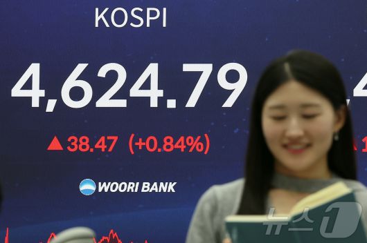 (서울=뉴스1) 김진환 기자 = 12일 오후 서울 중구 우리은행 본점 딜링룸 전광판에 코스피지수 종가가 나오고 있다. 이날 코스피는 전일 종가와 비교해 38.47포인트(p)(0.84%) 상승한 4624.79로 거래를 마쳤다. 2026.1.12/뉴스1
