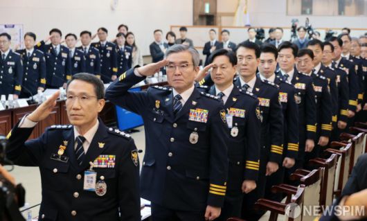 [서울=뉴스핌] 이길동 기자 =유재성 경찰청장 직무대행이 12일 서울 종로구 정부서울청사에서 열린 경찰청,산하기관 업무보고에서 참석 경찰간부들과 함께 국기에 경례하고 있다.[2026.01.12 gdlee@newspim.com |