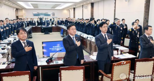 [서울=뉴스핌] 이길동 기자 =윤호중 행정안전부 장관이 12일 서울 종로구 정부서울청사에서 열린 경찰청,산하기관 업무보고에서 참석자들과 국기에 경례하고 있다.[2026.01.12 gdlee@newspim.com