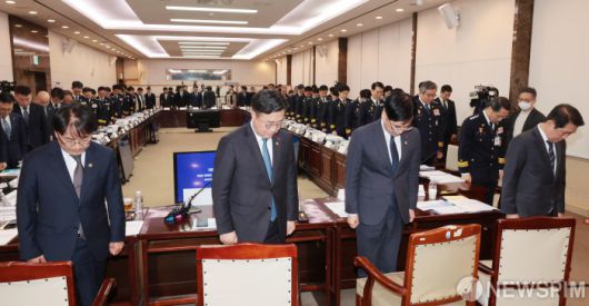 [서울=뉴스핌] 이길동 기자 =윤호중 행정안전부 장관이 12일 서울 종로구 정부서울청사에서 열린 경찰청,산하기관 업무보고에서 참석자들과 묵념을 하고 있다.[2026.01.12 gdlee@newspim.com