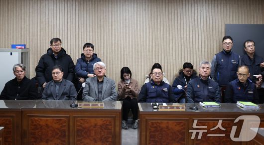 (서울=뉴스1) 구윤성 기자 = 김정환 서울시버스운송사업조합 이사장(왼쪽 앞줄 세번째)과 박점곤 서울시 버스노동조합 위원장(왼쪽 앞줄 네번째)이 12일 오후 서울 영등포구 서울지방노동위원회에서 열린 특별조정위원회 사후 조정회의에 참석해 있다. 2026.1.12/뉴스1