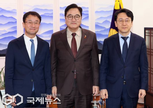 (서울=국제뉴스) 한병도 더불어민주당 원내대표가 12일 오전 우원식 국회의장을 예방하고 기념촬영을 하고 있다. 오른쪽은 천준호 신임 원내운영수석부대표./사진=이용우 기자