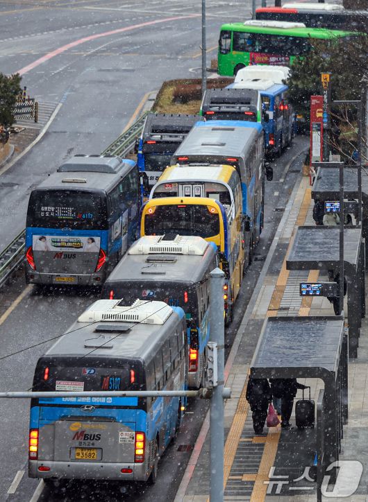 (서울=뉴스1) 이호윤 기자 = 서울시 시내버스 파업을 예고한 12일 서울 중구 서울역 환승센터에서 버스가 오가고 있다. 서울 시내버스 노조는 교섭 결렬시 13일 첫차부터 파업에 돌입할 예정이다. 2026.1.12/뉴스1