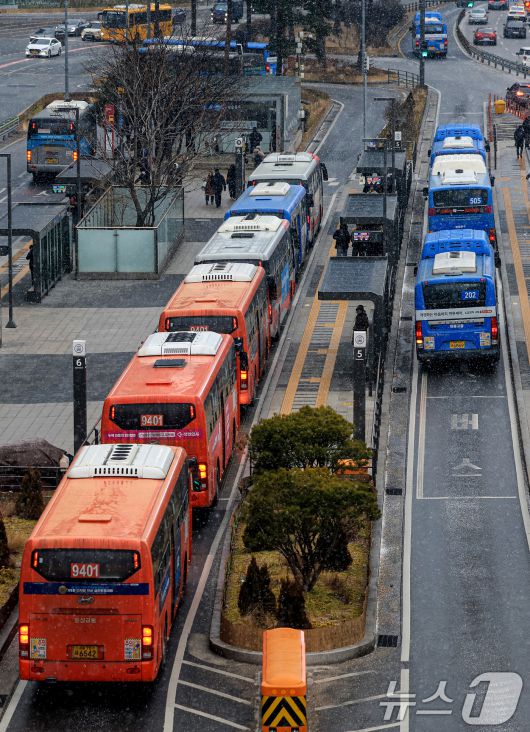 (서울=뉴스1) 이호윤 기자 = 서울시 시내버스 파업을 예고한 12일 서울 중구 서울역 환승센터에서 버스가 오가고 있다. 서울 시내버스 노조는 교섭 결렬시 13일 첫차부터 파업에 돌입할 예정이다. 2026.1.12/뉴스1