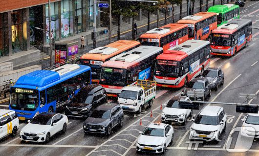 (서울=뉴스1) 이호윤 기자 = 서울시 시내버스 파업을 예고한 12일 서울 중구 서울역 환승센터에서 버스가 오가고 있다. 서울 시내버스 노조는 교섭 결렬시 13일 첫차부터 파업에 돌입할 예정이다. 2026.1.12/뉴스1