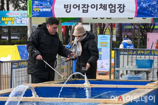 12일 서울 노원구 서울과학기술대학교 종합운동장에 마련된 '2026 노원 씽씽 눈썰매장' 장애인 가족 초청행사에서 참가자들이 빙어잡이 체험을 하고 있다. 노원구는 매년 씽씽 눈썰매장을 하루 동안 휴장하고 장애인과 가족 등 500여 명을 초청해 장애인 가족만을 위한 행사를 개최하고 있다. /정재훈 기자 |