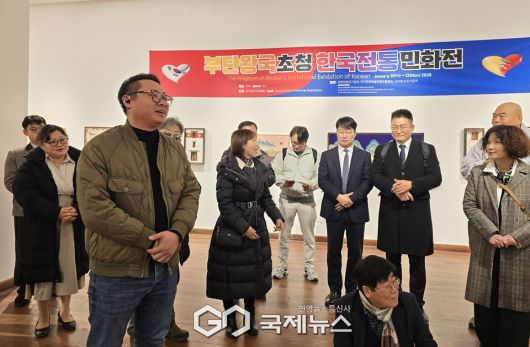 (부탄=국제뉴스) 유지현 기자 = 9일 부탄 팀푸시 RTA에서 '제2회 부탄 국제 ESG 동맹포럼' 부대행사로 열린 '부탄왕국 초청 한국 전통 민화전' 개막식에서 축사를 하는 중국 초청작가 쉐민(薛旻, 왼쪽 세 번째).