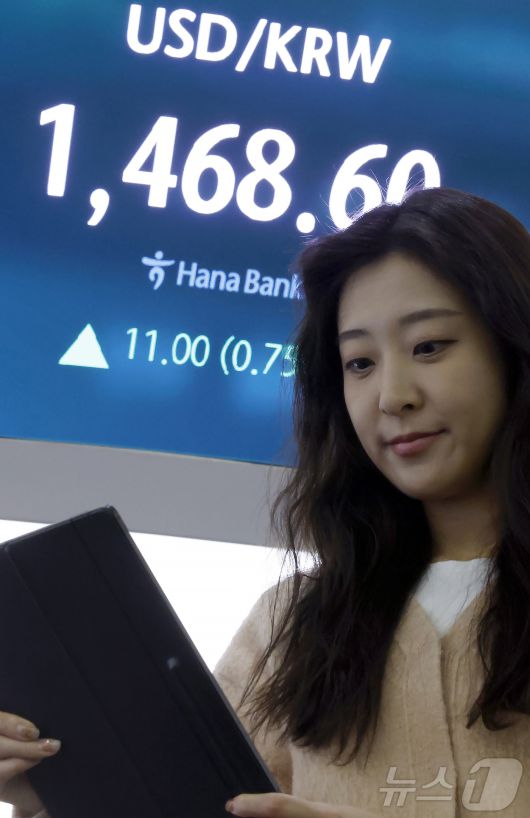 (서울=뉴스1) 박정호 기자 = 12일 오후 서울 중구 하나은행 본점 딜링룸 전광판에 원달러 환율이 표시되고 있다. 이날 코스피는 전 거래일 대비 38.46포인트(0.84%) 오른 4624.78, 코스닥은 1.90포인트(0.20%) 오른 949.82으로 장을 마쳤다. 오후 3시 30분 서울외환시장에서 달러·원 환율은 전일 오후 3시 30분 주간종가 대비 10.8원 오른 1468.4원을 기록했다. 2026.1.12/뉴스1