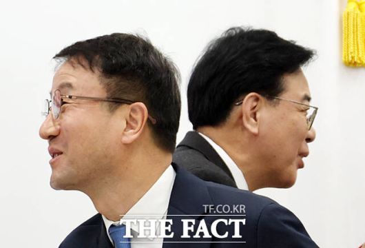 이에 한 원내대표는 "송 원내대표께서 '새 부대에 새 술을 담자'는 표현을 하셨는데, 새 술을 새 부대에 담기 위해서는 잘못된 과거와의 단절을 위해 헌 부대를 과감히 청산하는 것도 필요하다"라고 답했다.