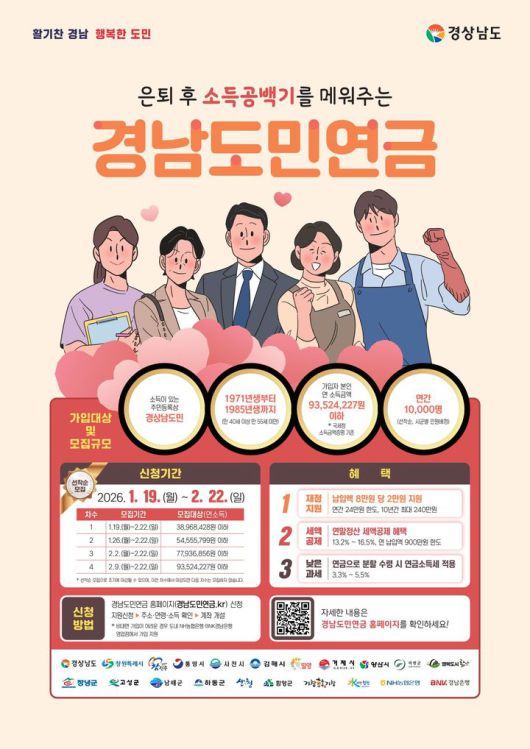 신청은 경남도민연금 홈페이지에서 온라인으로 가능하며 이후 NH농협은행 또는 BNK경남은행 앱·영업점을 통해 IRP 계좌를 개설해야 최종 가입이 확정된다. 2월 말까지 계좌를 개설하지 않으면 자동 제외된다.