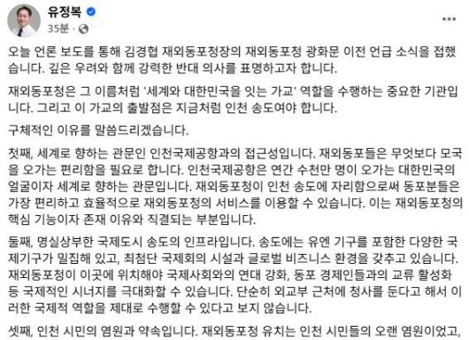 또 그는 "재외동포청 유치는 인천 시민들의 오랜 염원이었고, 우리 시의 중요한 핵심 정책이었다"며 "이제 와서 갑작스러운 이전 논의는 그간의 모든 노력을 무산시키고 인천 시민들의 기대와 희망을 저버리는 행위"라고 비판했다.