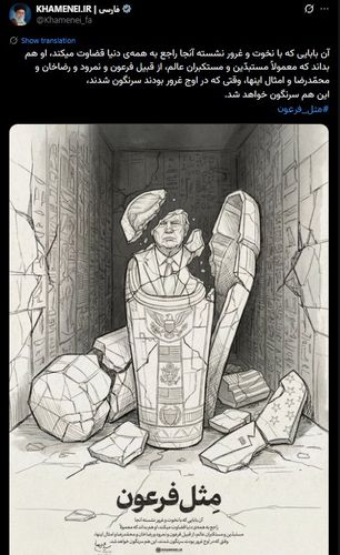 이란 최고지도자 아야톨라 세예드 알리 하메네이의 공식 엑스(X) 계정은 현지시간 12일 새벽 트럼프 대통령의 상반신 모양을 한 석관이 부서져 내리는 모습의 삽화를 게시했습니다.
