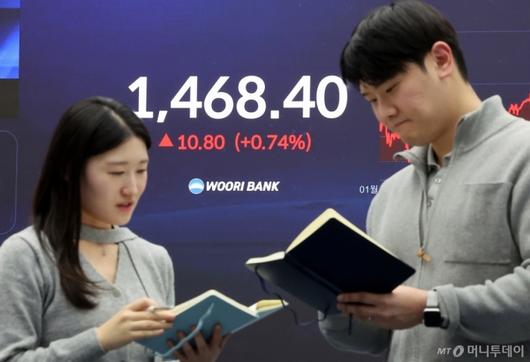 (서울=뉴스1) 김진환 기자 = 12일 오후 서울 중구 우리은행 본점 딜링룸 전광판에 증시 표시가 나오고 있다. 서울외환시장에서 달러·원 환율은 전일 오후 3시 30분 주간종가 대비 10.8원 오른 1468.40원을 기록했다. 2026.1.12/뉴스1 Copyright (C) 뉴스1. All rights reserved. 무단 전재 및 재배포, AI학습 이용 금지. /사진=(서울=뉴스1) 김진환 기자 |