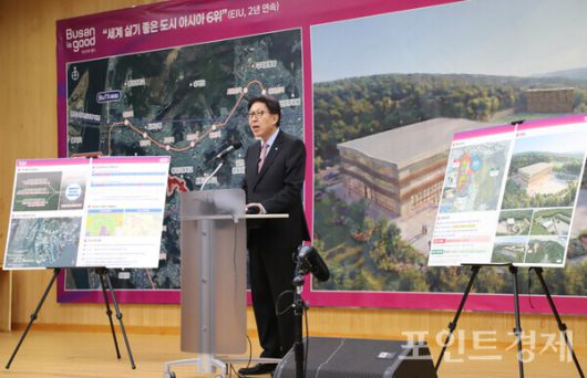 박형준 부산시장이 12일 오후 2시 사하구청 대강당에서 기자회견을 열고 복합문화체육공간으로 조성하는 개발계획(안)을 공개하고 있다. (사진=윤선영) ⓒ포인트경제 |