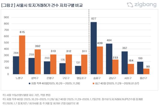 반면 같은 기간 기존 토허구역인 송파구(827건 → 439건), 강남구(484건 → 233건), 서초구(362건 → 164건), 용산구(199건 → 90건) 등에서는 허가건수가 줄었다. 이 지역에서는 장기간 지속된 규제에 대한 피로감, 높은 가격 수준에 대한 부담과 고점 인식 등으로 추가 수요 유입 동력이 약해진 것으로 풀이된다.
