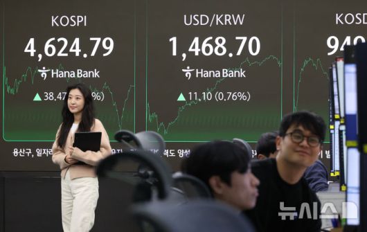 [서울=뉴시스] 황준선 기자 = 코스피가 전 거래일(4586.32)보다 38.47포인트(0.84%) 오른 4624.79에 마감한 12일 오후 서울 중구 하나은행 딜링룸에 지수가 표시돼 있다. 코스닥 지수는 전 거래일(947.92)보다 1.89포인트(0.20%) 상승한 949.81에 거래를 마쳤다. 서울 외환시장에서 원·달러 환율은 전 거래일(1457.6원)보다 10.8원 오른 1468.4원에 주간 거래를 마감했다. 2026.01.12. hwang@newsis.com |