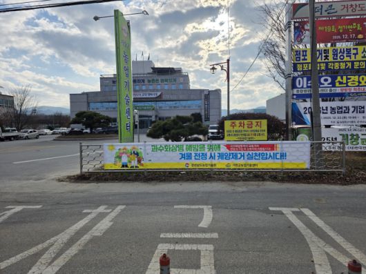 거창군이 농업기술센터 청사 출입구 휀스에 과수화상병 예방 현수막을 게첨해 홍보를 하고 있다. /거창군 |